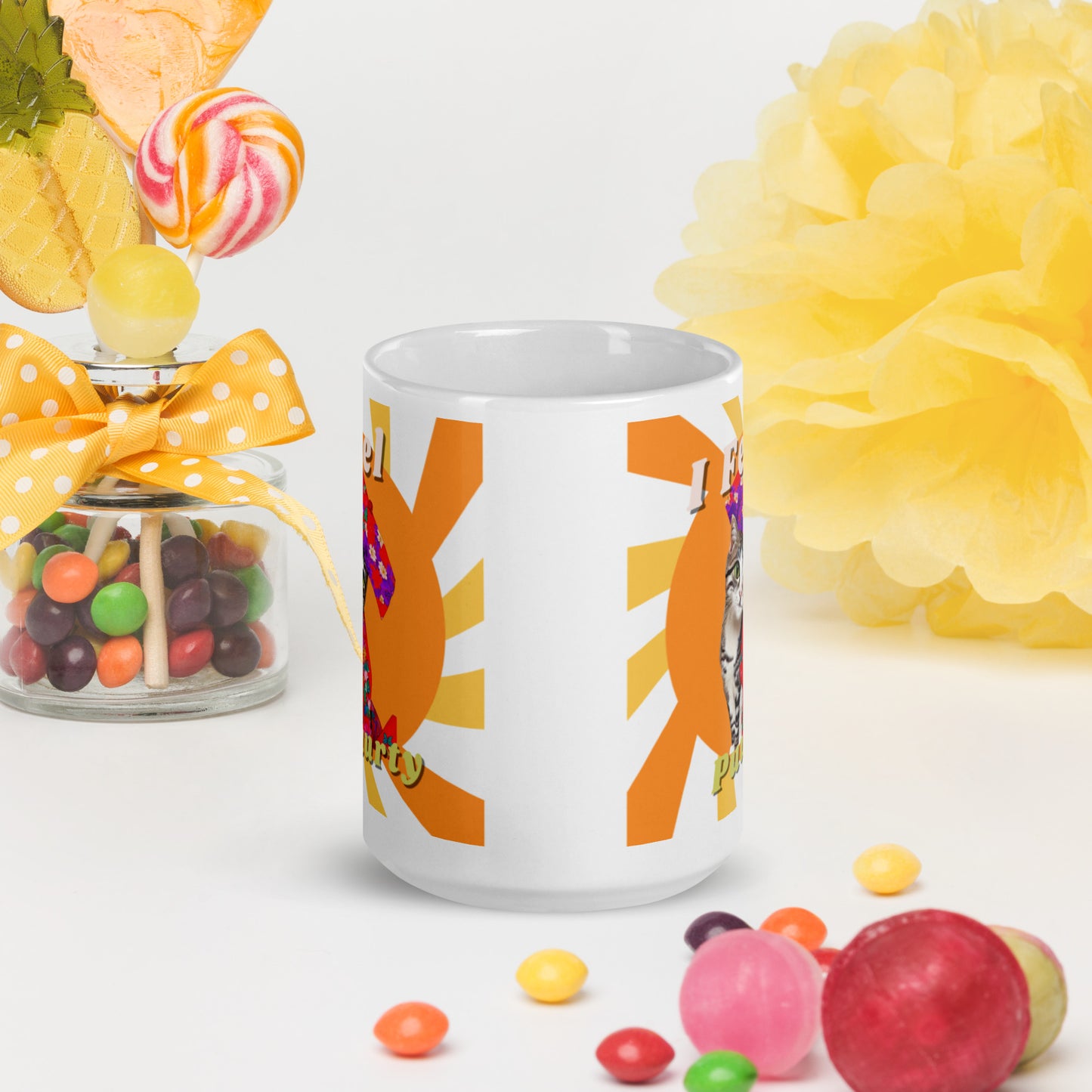 This sturdy mug featuring our adorable "Puuurty" cat is perfect for your morning coffee, afternoon tea, or whatever hot beverage you enjoy. It has a glossy white finish and yields vivid prints that retain their vibrancy in the dishwasher and microwave.